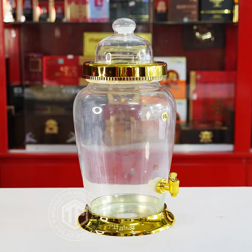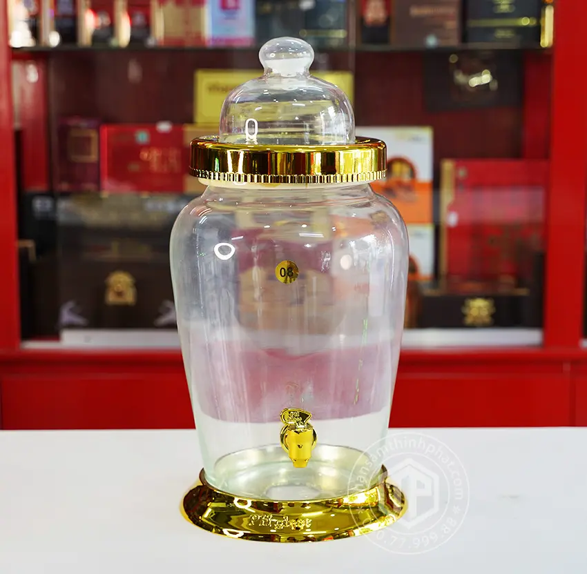 Bình thủy tinh này được thiết kế với dung tích 8 lít và được trang bị vòi, giúp dễ dàng điều chỉnh lượng rượu khi sử dụng. Với sự kết hợp giữa dung tích lớn và tính năng vòi, bình thủy tinh này trở thành một lựa chọn lý tưởng cho việc lưu trữ và sử dụng rượu.