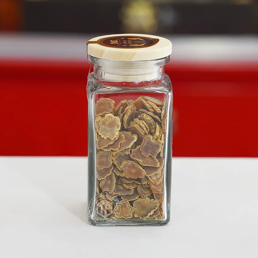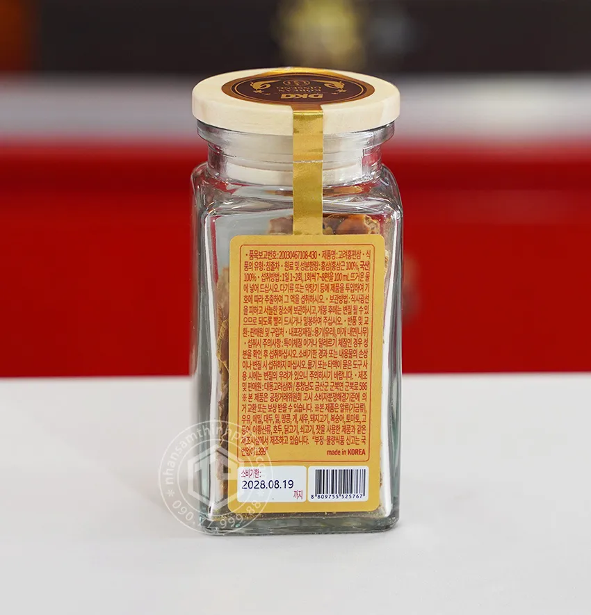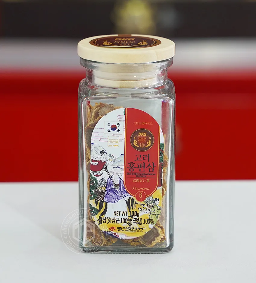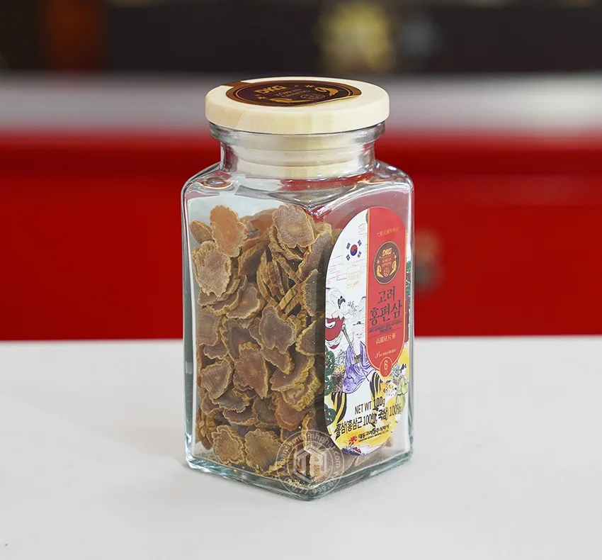 100% nhân sâm Geumsan Hàn Quốc qua quá trình hấp sấy thành hồng sâm củ khô nguyên chất, được sấy khô thái lát sẵn, và đóng lọ thủy tinh tiện lợi sử dụng.