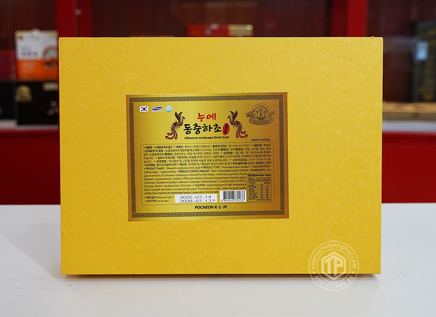 - Ngoài ra, hộp vàng 60 gói nước đông trùng hạ thảo Hàn Quốc có thiết kế đóng hộp sang trọng và dạng gói tiện lợi. Đây là món quà có giá trị đặc biệt, thích hợp để tặng cho người thân trong các dịp lễ tết, mang theo ý nghĩa đặc biệt.