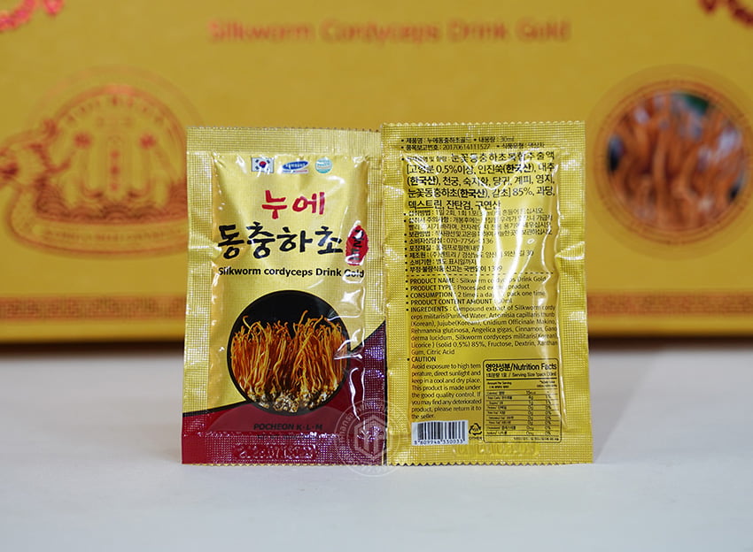 Nước đông trùng hạ thảo Hàn Quốc hộp vàng 60 gói thương hiệu KangHwa được làm từ đông trùng hạ thảo buôi trồng, cung cấp hàm lượng dinh dưỡng dồi dào