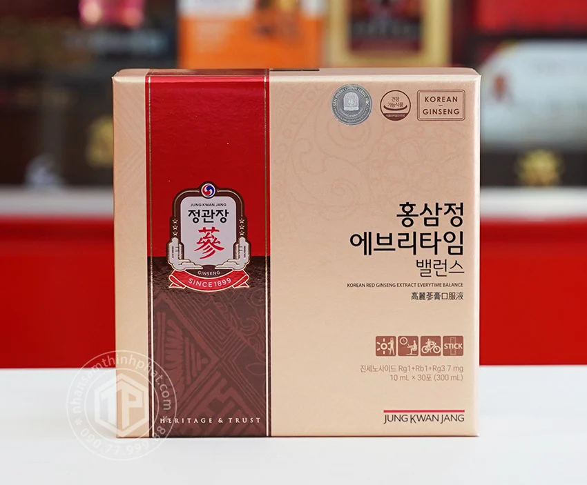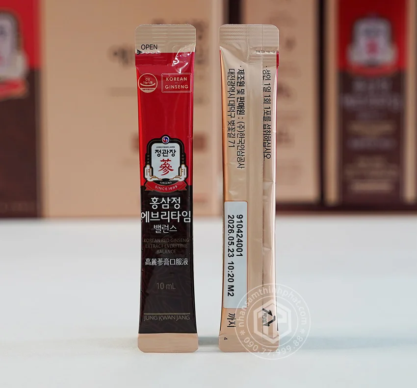 Thành phần: Tinh chất hồng sâm Hàn Quốc cô đặc (6 năm tuổi, thành phần rắn 64%, ginsenoside Rg1+Rb1+Rg3 5.5mg/g) 21% ( tỷ lệ pha trộn 75% củ sâm, 25% rễ sâm ), siro cây thùa, nước tinh khiết, fructo-oligosaccharides, chiết xuất cam thảo, chiết xuất siro gừng (Hàn Quốc), keo ong (Úc).