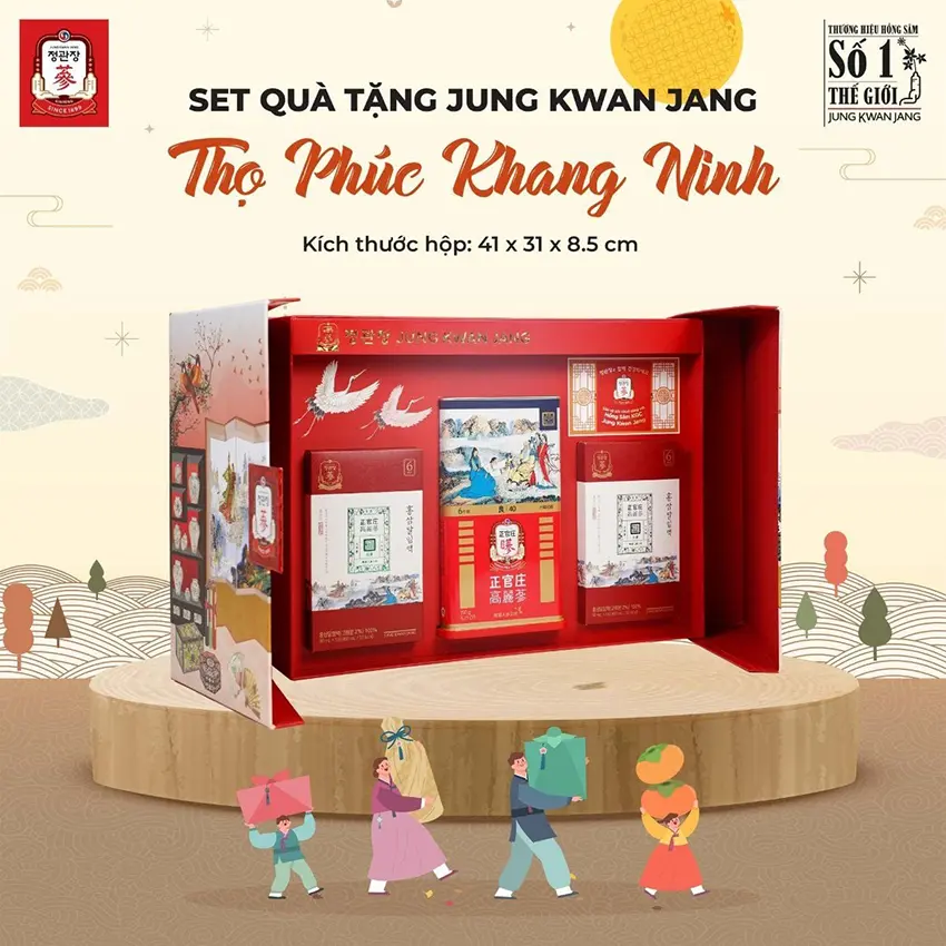 Là set quà tặng cao cấp nhất thuộc BST phiên bản giới hạn Limited Edition của Hồng sâm Jung Kwan Jang, THỌ PHÚC KHANG NINH đại diện cho lời chúc "Tứ Phúc" bao gồm "Thọ" của trường thọ, "Phúc" của hạnh phúc, "Khang" của khỏe mạnh và "Ninh" của bình an. Sự kết hợp giữa Lương Sâm Nguyên Củ thượng hạng và Nước sắc hồng sâm Pure Extract là lựa chọn quà tặng hoàn hảo cho những vị khách quý thường xuyên dùng sâm nguyên chất, yêu thích hương thơm và vị đắng thuần của hồng sâm Hàn Quốc.