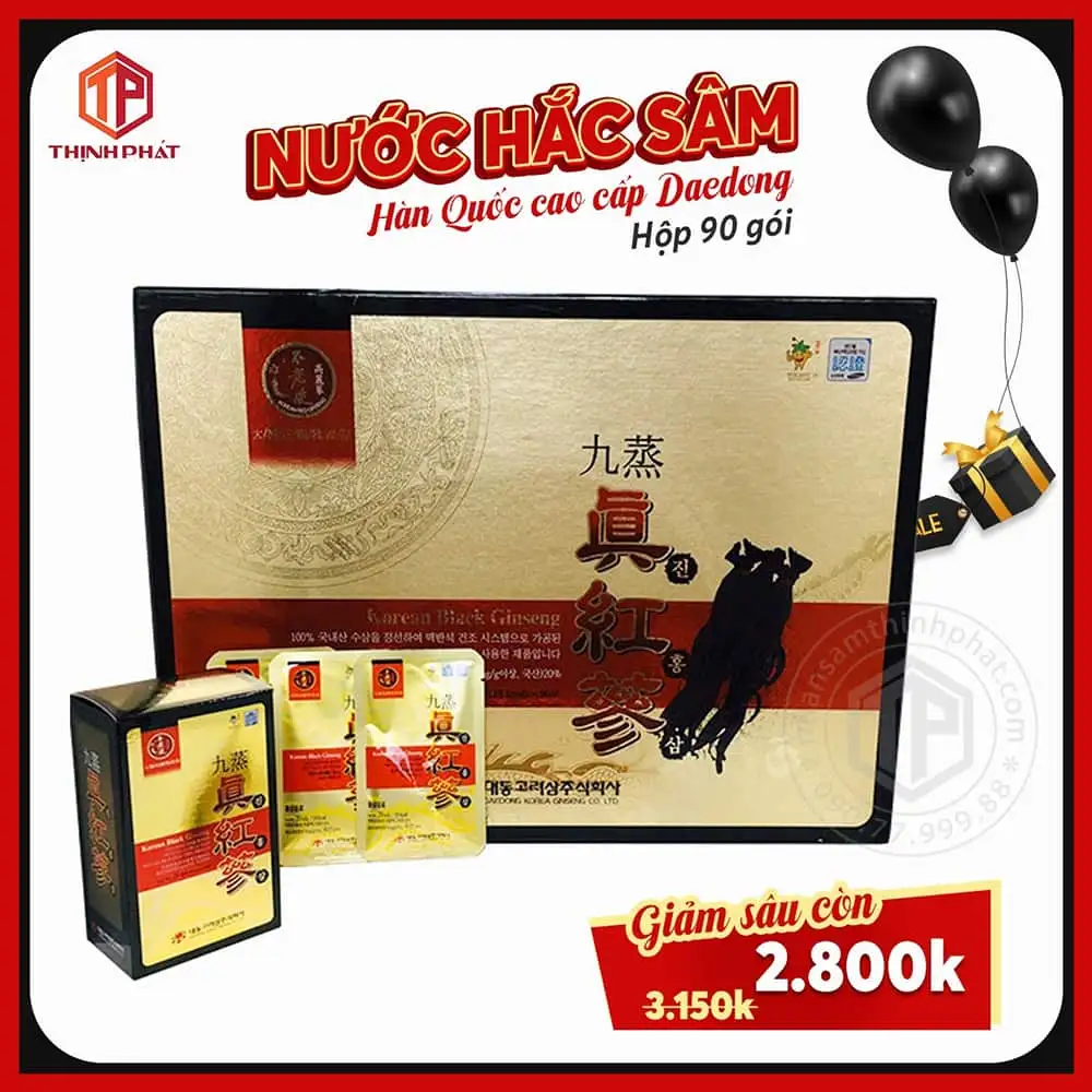 Nước hắc sâm Hàn Quốc đẳng cấp Daedong, được đóng gói trong hộp chứa 90 gói, là nguồn tinh chất hắc sâm 6 năm tuổi, giàu đầy các dạng Saponin và nhiều loại Vitamin có lợi cho cơ thể. Được kết hợp với nhiều loại thảo dược tự nhiên như nấm linh chi, quế, quả mâm xôi, củ dong,...
