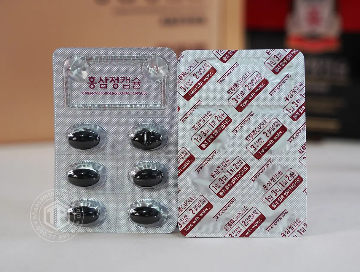 Thành phần: Chiết xuất hồng sâm Hàn Quốc (6 năm tuổi, thành phần rắn 95%, ginsenoside Rg1 + Rb1 + Rg3 7mg/g) 35% (tỷ lệ pha trộn : củ sâm 75%, rễ sâm 25%), dầu mầm lúa mì (Đức), Dầu cọ (Malaysia), dầu hạt nho, Milnam, lecithin. Thành phần vỏ viên nang : tinh bột hydroxypropyl starch, glycerin, carrageenan, màu cacao (có chứa bột mì, đậu nành)